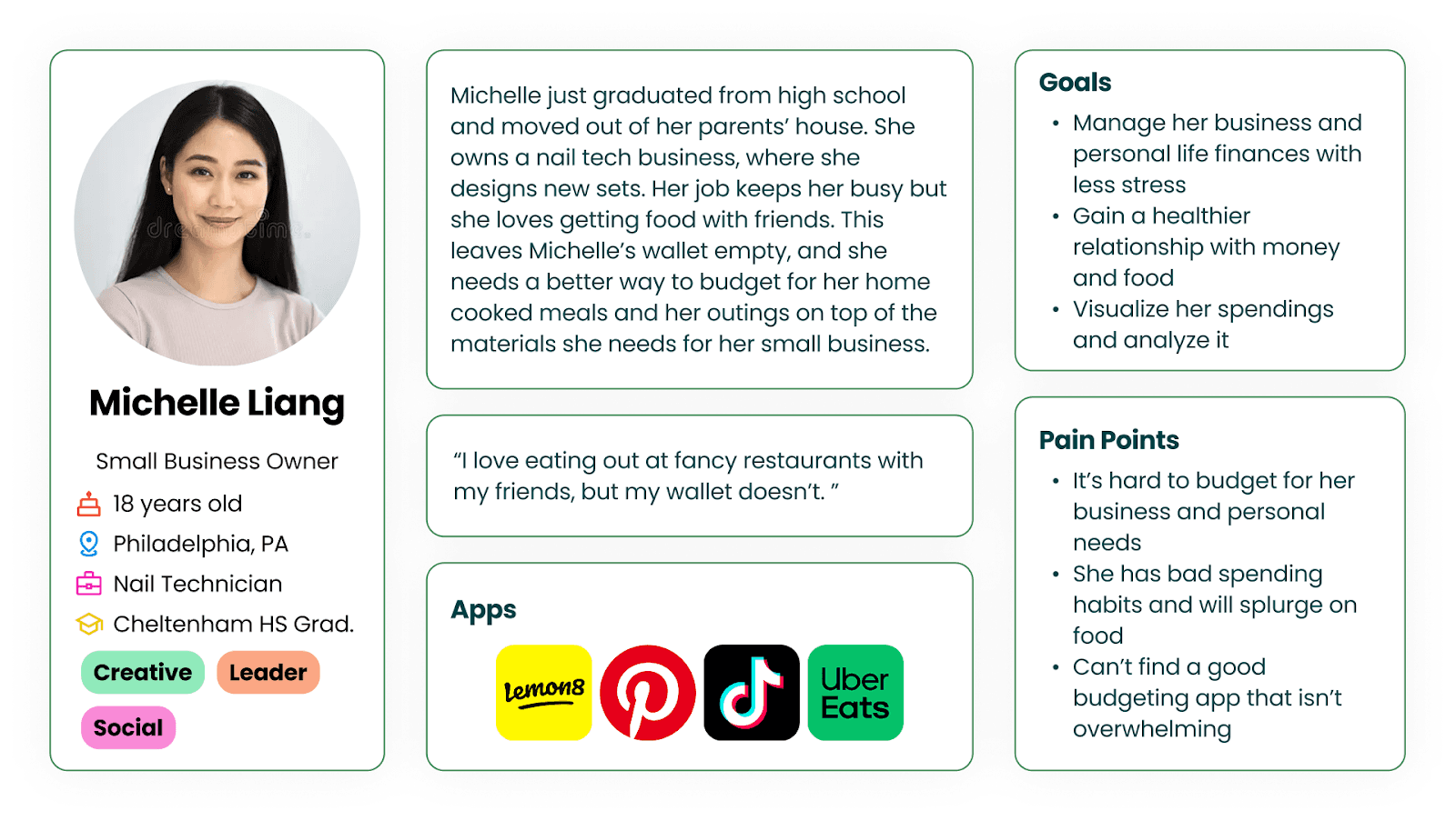 Description: Thinking about our problem and goals, we created 3 personas that reflected our target audience. We created the personas Rose Minervini, Michelle Liang, and Aiden Samuel. They encompass our target audience of 18-26 year olds, and help us figure out exactly who to design for.