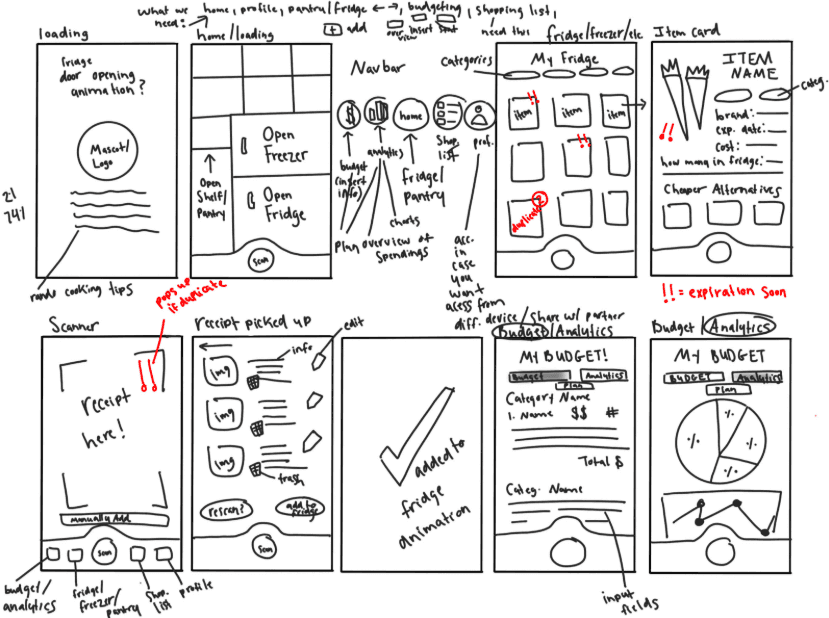 Description: Using the insights gathered from the NUF analysis, the design team began sketching initial concepts for the app’s core features. These sketches explore layout structures, key interactions, and visual hierarchies to translate research findings into early design ideas. The goal is to establish a foundation for the upcoming wireframe phase