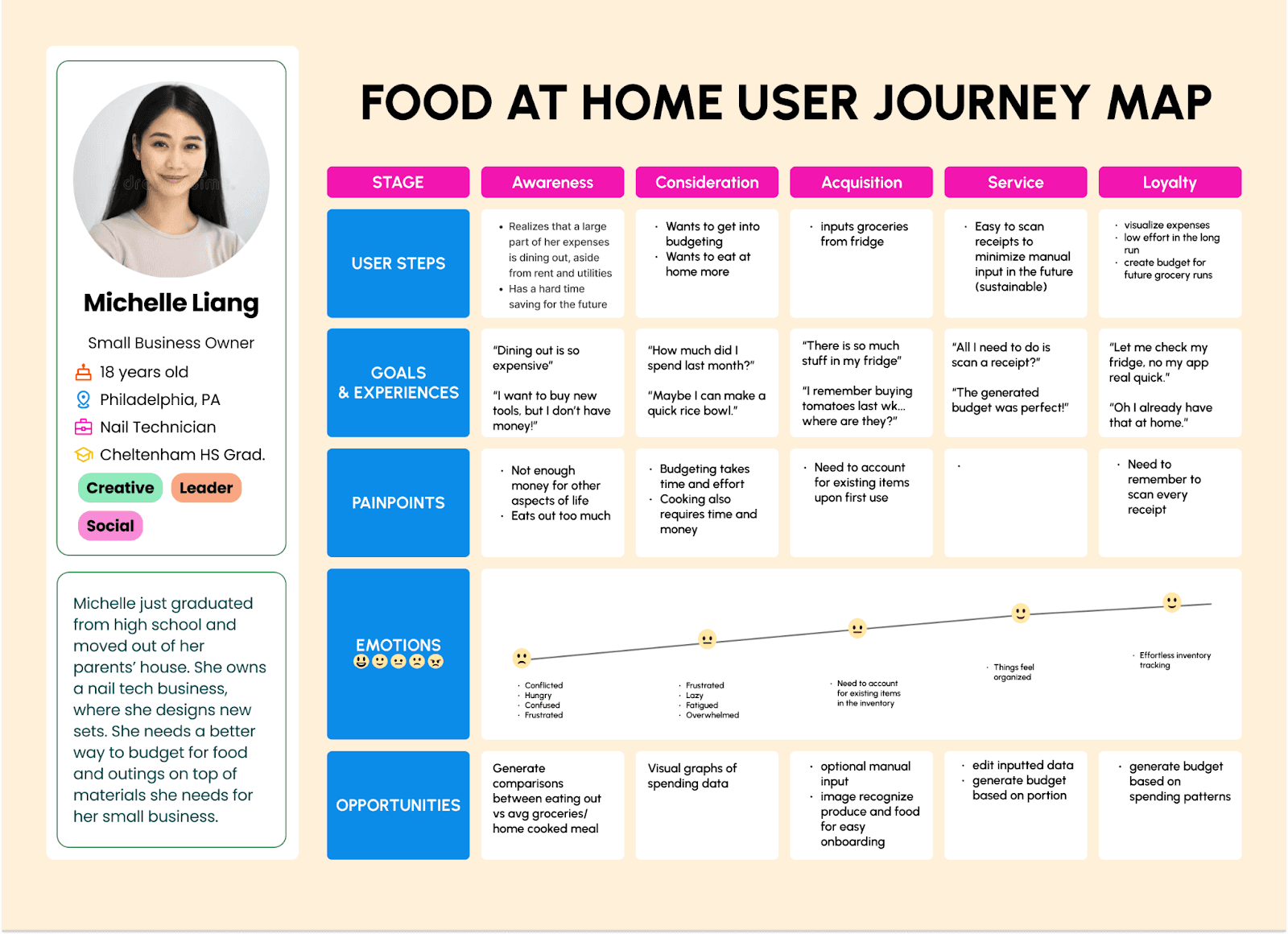 Description: Utilizing our personas, we created journey maps encompassing the specific journey each of our personas would have. We each picked a persona to map out, and went through the steps, experiences, pain-points, emotions, and opportunities of each. These will guide our choices in design screens, to better suit the user and their journey using our app.