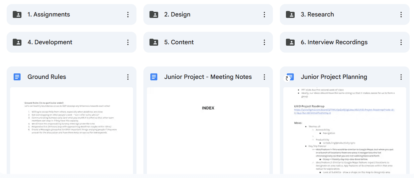 Description: Create an organization system on Google Drive in addition to Teams. There are 6 Main categories: assignments, design, research, development, content, and interview recordings.